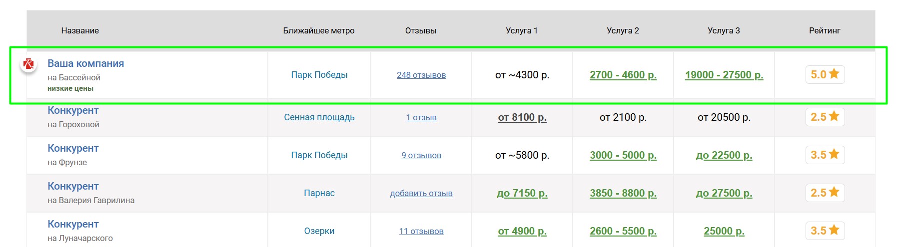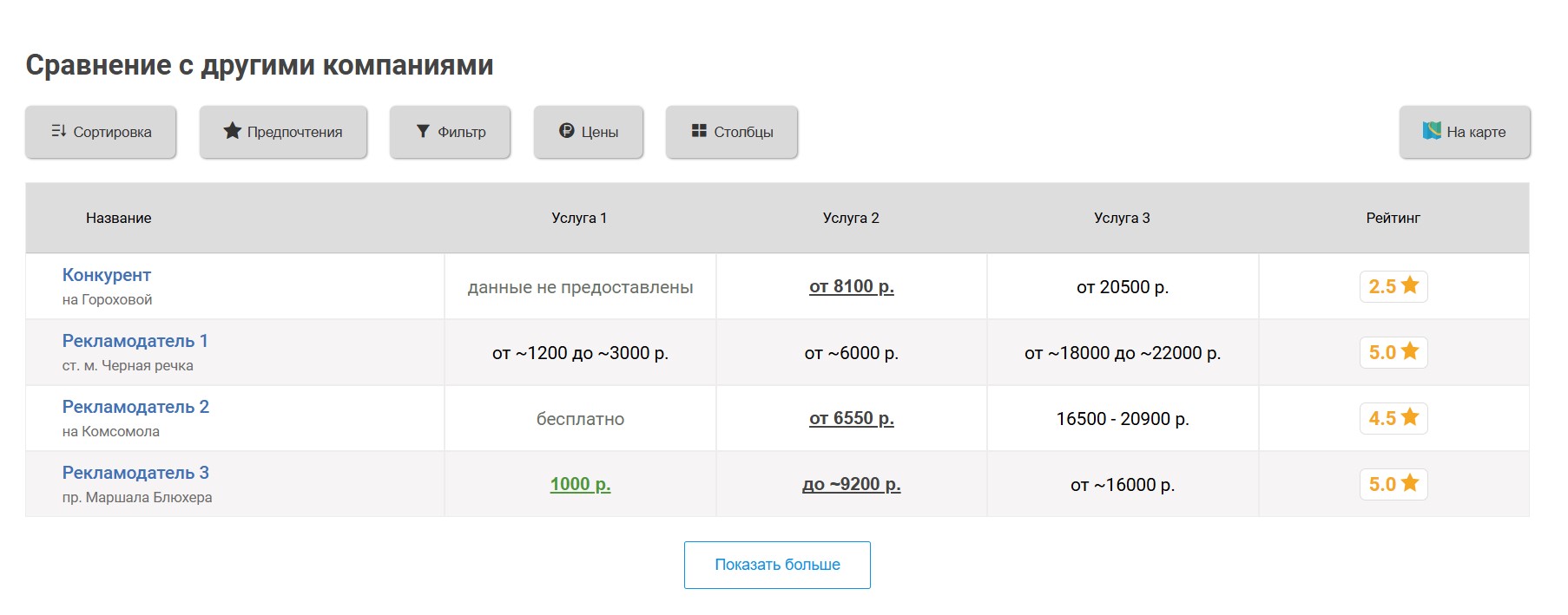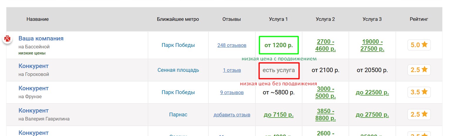 компаний, продвигаемая компания попадёт к ним в таблицу «Сравнение по ценам», которая выглядит следующим образом: